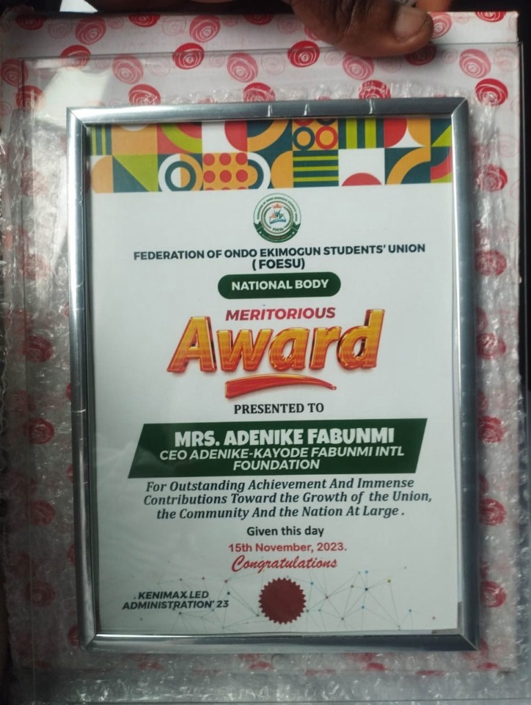 At the celebration of the Annual FOESU National Festival, Mrs Adenike Adetuyi-Fabunmi received a meritorious award for her outstanding achievements, commitment, and great contributions to Ondo Kingdom, as well as his contribution to the Student body.