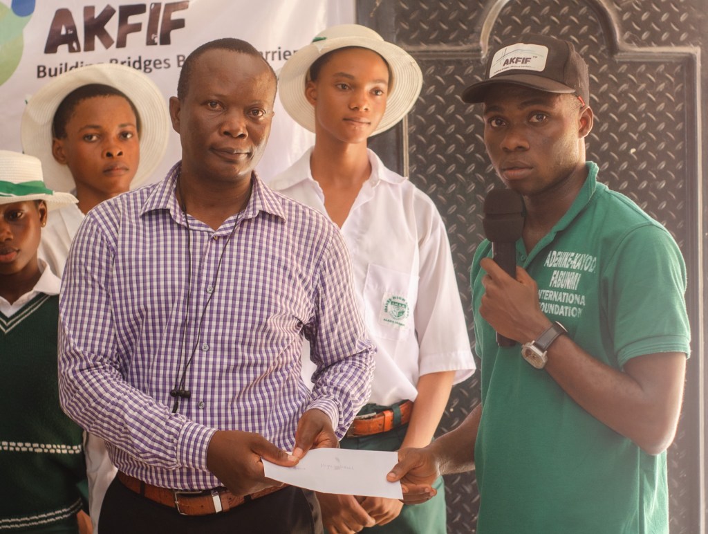 Mr. Abayomi presented a ₦20,000 cheque to Methodist High School representatives, Odode Idanre (second runner-up), a #30,000 cheque to Ilemobola Girls Grammar School representatives (first runner-up), and a ₦40,000 cheque to St. Joseph Catholic Grammar School representatives (winner).